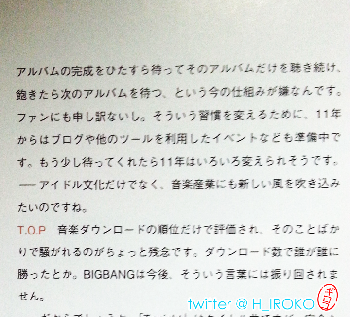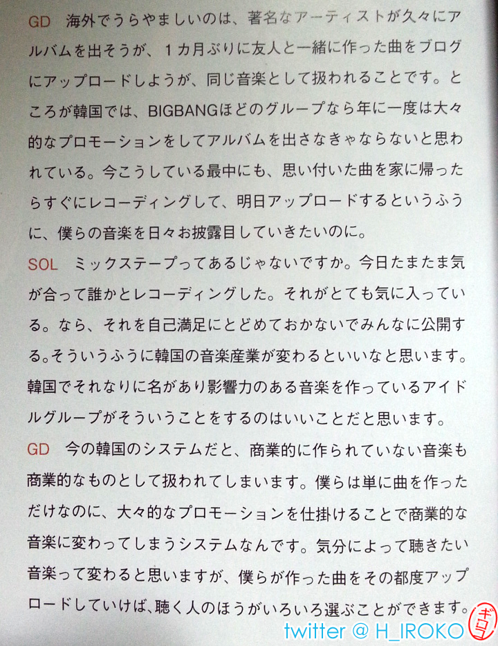 【 ふと思った事。 2014年8月28日(木) 】 ゴールデンボンバーのボーカル・鬼龍院翔さんの公式ブログの一昨日の日記を拝見しました。 「握手会等の特典を一切排除し、CDのみをリリースしたら、売上げはどうなるんだろう」 という今の日本の音楽業界に一石を投じてくれた金爆。 発売1週間後の売上枚数や鬼龍院さんが感じた事を綴ったブログ日記です。 とにかくまずは読んで欲しいです。 絶対絶対!読んで欲しいです。 むしろ私の日記の続きは読まなくてもいいからw、鬼龍院さんのブログだけでも読んで欲しいです!!!www ゴールデンボンバー 鬼龍院翔オフィシャルブログ「キリショー☆ブログ」 8月26日付 ”ローラ発売一週間” ⇒ こちらからどうぞ! エンタメニュースでも話題になっていたので、この話は私も経過が気になっていたところでした。 以前(ファンからの大量のプレゼントの行き先について)のブログ日記を拝読したときも思ったのですが、鬼龍院さんて人間的に凄く魅力的な方ですね(*´艸`) 金爆ファンの皆さんは幸せだなぁと感じました。 鬼龍院さんの文章にはぐいぐい引き込まれる魅力にあふれていて、 今回のブログ日記も1文字1文字噛み締めて拝読させて頂きました。 そして当然、比較せずにはいられない某事務所への思い。 BIGBANGの日本での大活躍には、なにより事務所の働きがあってこそ成し遂げられているのもわかっています。 売上げが伸び利益を得てこそ、活動の幅が広がり、その内容も充実していることも。 日頃、あの事務所の商売方法には暴言が止まらない私ですがwww、 売上げを伸ばす努力が必要不可欠なのはよく理解してるつもりだし、 尋常じゃないやり方を批判する一方で、 商売上手だな、伸びる会社はちゃんと理由があるな、とどこかで感心している自分もいます。 そーゆー理由で、アーティストと事務所の目指すベクトルの違いを100%揃える事はおそらくどの事務所でも絶対に無理だと思います。 (良い曲だと知ってもらえれば売れなくてもいい、という考えの事務所を除いて(笑)) ただ、今日、鬼龍院さんのブログを拝見し、 こういう考えのアーティストを持ち、時にはアーティストの意見を尊重する事務所があること、 それは絶対に不可能ではないんだという事を知ることができました。 いいスタッフが多く、良い空気の中で運営されていらっしゃる事務所なんだろうなぁと思いました。 あの事務所に金爆の事務所みたいになって欲しいなんて絶対に言いません。(まず無理w) ただ、ここ最近、不条理だと思うことが多すぎる。 不満を抱くファンはあきらかに激増しています。 悔しいけど惚れた方の負け。 私達は、それにつけこんだ商売の顧客なのも事実。 初めてVIPシートができた時、みんなが不満を口にしました。 「私は絶対こんなシート買わない」と誰もが最初はグチりました。 だけど気づけば当然のように支払うのがあたりまえになりました。 膨大な値上げの理由も明確にされないまま、私達は現在、チケット1枚に2万5000円を支払う客になりました。 おそらく一般席の値上げも時間の問題。 気づけばVIPシートは4万円という日がくるかもしれない。 大好きなBIGBANGの音楽が好き、彼らが好き。 でも今、それだけでは済まなくなってしまいました。 いまの私達にとってのBIGBANGとは、 彼らの音楽に浸り、ステージに魅了される存在である以上に、 CDとは名ばかりの特典抽選券に多額を支払い、 事務所の商売に乗って金を払えば払うほどその喜びを得られる、という対象にもなってしまいました。 裏を返せば、 金が払えないなら指くわえて羨ましがってろ、という扱いを受けるようになりました。 は?なにをグチグチと。 文句言うなら買わなきゃいいじゃん。 ごもっともですw ただ、鬼龍院さんをはじめとする、 アーティストの考えは決してこのような商売を歓迎しているとは思えないのです。 歓迎できない、でもしょうがない、 という思いを心に抱きながら曲を作り活動をしているように思えてしょうがないんです。 もちろんBIGBANGも。 ところで、 私は別に事務所の運営への不満をグチろうと思って日記を書いたわけではなくて(´∀`;) 私が大好きなインタビューがあります。 2011年、「TONIGHT」でカムバックをした当時、雑誌10asia(テンアジア)に掲載されたインタビューです。 この記事は本当に良いインタビューなので、近いうちに全文を入力しUPしたいと思っています。(ロングインタビューすぎて中断していますがw) 2011年は、2008年「ブルグンノウル(赤い夕焼け)」での活動以来、韓国では久しぶりの5人でのカムバックの年でした。 そんな彼らだからこそ、当時の意気込みやBIGBANGについて、本音を熱く語っているインタビューです。 その中にある、一番印象深く、個人的に大好きなくだりがあるので、その部分を掲載したいと思います。 彼らが「BIGBANGはこうでありたい」という想いがここに詰まっています。 テンアジア(日本版)2011年 インタビューより (私の和訳ではありません