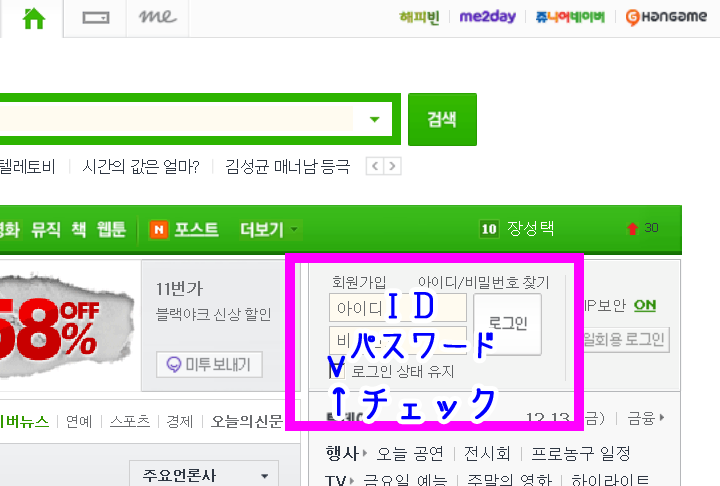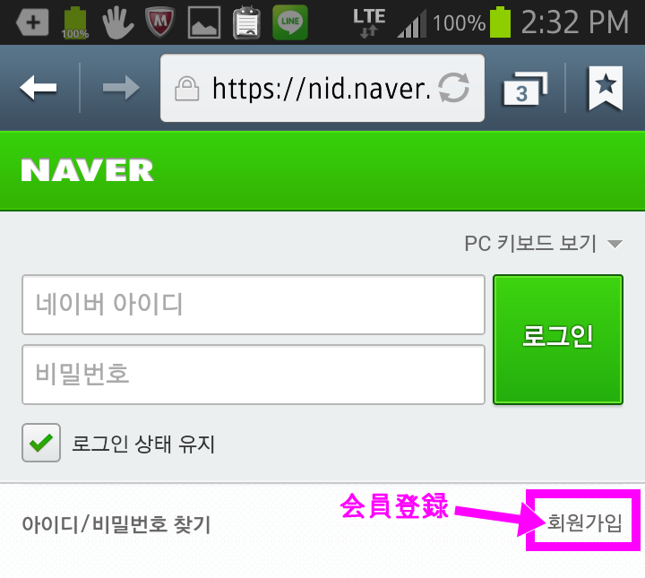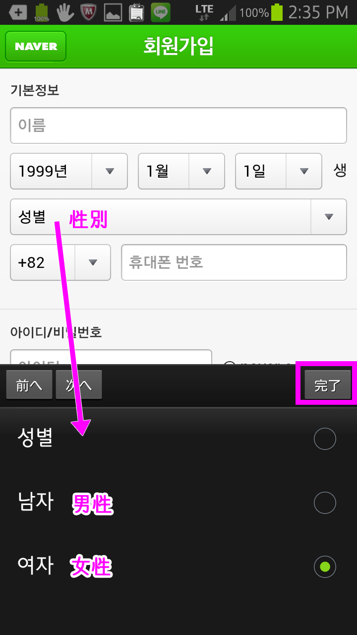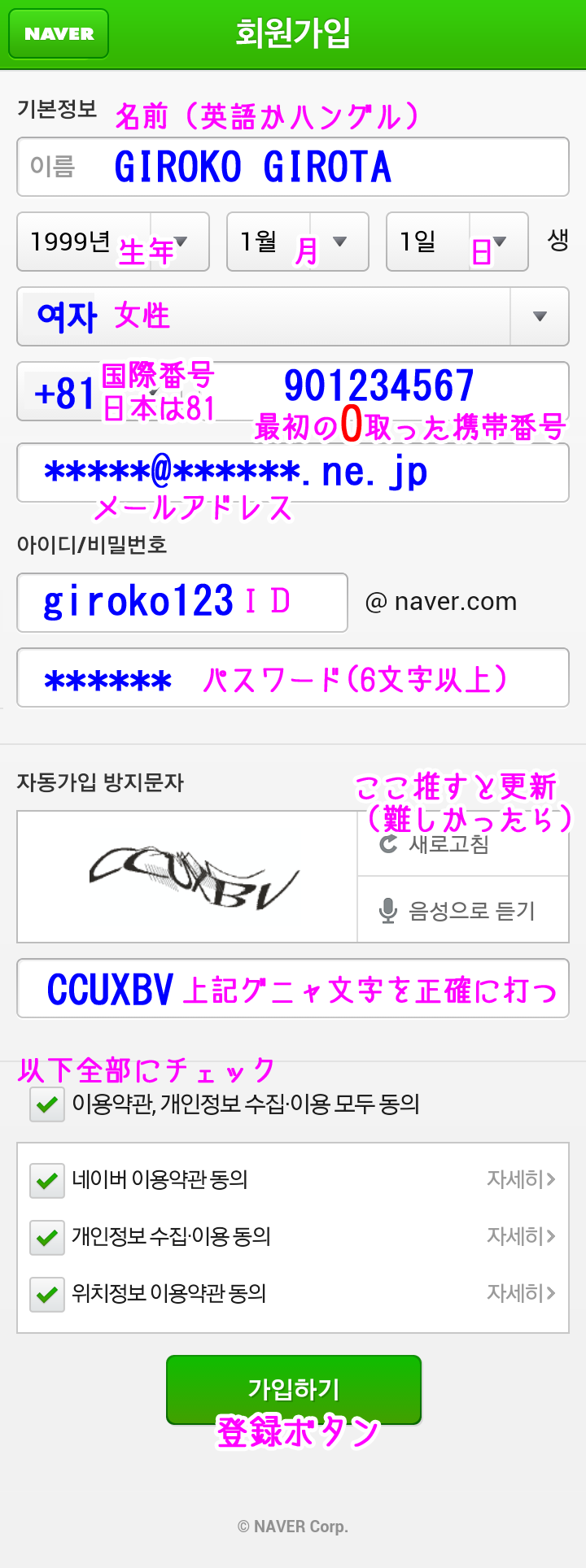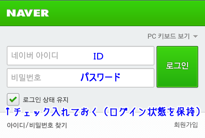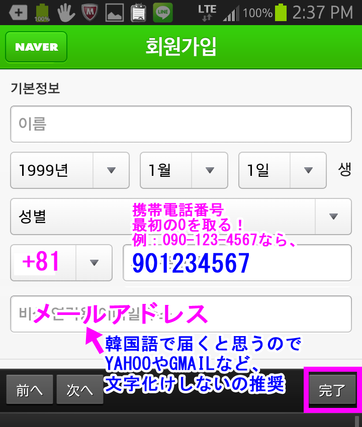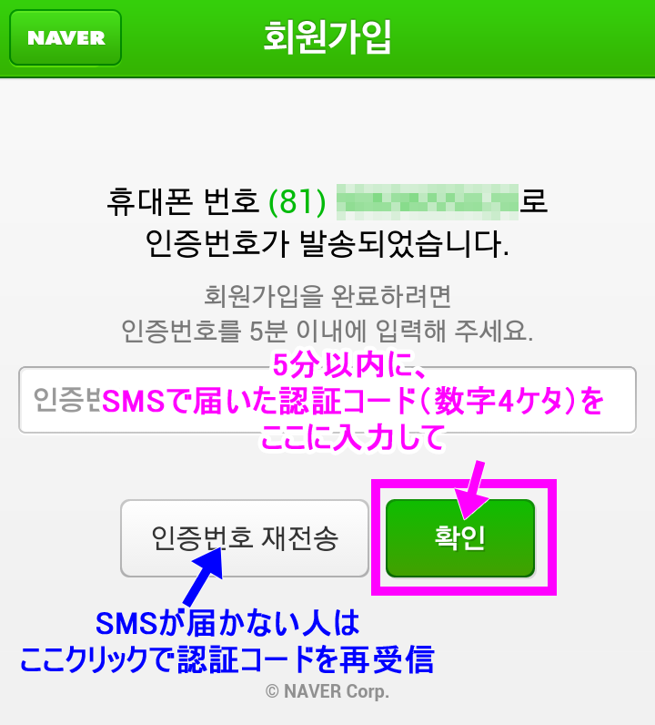 韓国NAVER スマホから登録する方法 ※事前準備 時間と気持ちにゆとりのある人はw、 先に「海外SMS受信」の確認をしておくといいかもしれません。 携帯の「海外SMS受信拒否」設定になっていないかこちらを参考に確認しておいて下さい。 ではいざ登録! @スマホからNAVERにアクセスし、 一番下まで行ってココをタップ。 ![]() A画面右下のココをタップ。 ![]() B下記を見よう見真似で入力&選択するだけー。簡単w 次の項目でちょっと注意するとこ挙げます。 ![]() C性別を下記を参考に選択してね。 ![]() D電話番号の国際識別番号を選択します。 日本の「81」を選択してください。 (ここを間違えると認証コードが届かないので注意) ![]() E電話番号は最初の「0」を取った携帯電話番号を入力します。 (例:090-123-4567なら「901234567」と入力) それから、すぐ下にメールアドレスを入力するテキストBOXが現れます。 韓国語で届いても文字化けしないよう、YahooメールやgmailなどのWEBメールなどを推奨します。 ![]() F今一度、下記をチェックしたら、最後の完了ボタンを押します ![]() Gすぐに!SMSで4ケタの数字が届きます。 5分以内に!入力します。 ![]() 【認証コードが届かない場合】 認証コードはGの手順後、数秒ですぐに届きます。届かない場合は 「海外からのSMSを受信を拒否する」にチェックが入ってる可能性が高いです。 (実は私がそうでしたw気付くまで7時間つまづきましたw) 端末の設定で、「海外からのSMSを受信拒否」にチェックが入っていると、 NAVERからSMSが全く届かないので登録ができないのです。 というわけで、以下を参考に海外SMS受信拒否を解除します。 ■ソフトバンクの場合 ■ドコモの場合 ■auの場合 解除して、改めて@から進んで下さい。 H認証コード入力後、この画面が出ればOK! ![]() IログインはNAVERにアクセスし、 一番下のココです。 ![]() ![]() 今作ったID&パスワードはもちろんPCからもログインできます。 パソコンのログイン画面ココ。 ![]() ※パソコンから会員登録したい方は、こちらに詳しく書いて下さった方がいらっしゃいました。 http://mylovetabilogs.blogspot.jp/2013/06/naver.html |