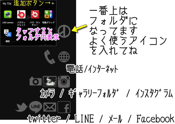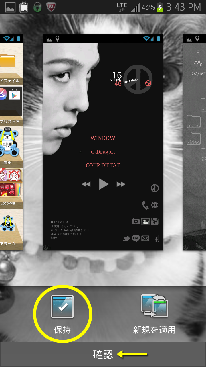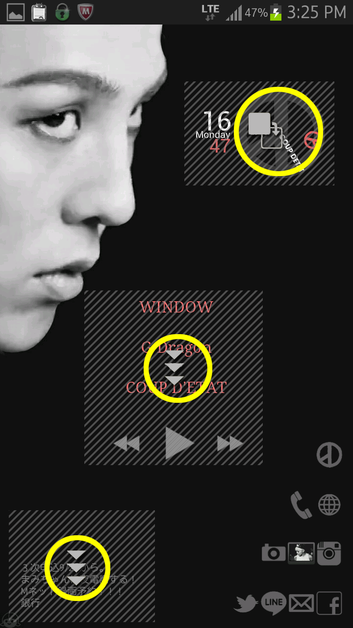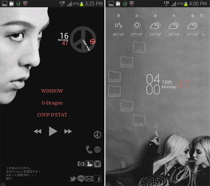 G-DRAGON "BLACK" Launcher COUP D'ETAT収録曲「BLACK」からインスピレーションを受けて作ったランチャーです(*´艸`) ![]() 注意:(設置前に必ずお読み下さい) こちらはAndroid専用ランチャーです。 iPhoneは対応していません。 理由: iPhoneはアイコンやウィジェットの配置およびデザインの背景透視などのカスタマイズができない為、 今回のデザインをiPhoneで再現するのはまず無理だからです。 ご了承ください。 また、BUZZランチャー自体が、Android4.0.3以上を対象としています。 それより古いバージョンの場合、アプリ自体が使えません。 こちらもどうかご理解をお願いします。 ダウンロードへすぐ行きたい方はこちら>> G-DRAGON BLACK Launcher 画面の説明 1ページ目の最上部はバッテリー残量付きの簡易時計です。 じよんのCOUP D'ETATのシンボルマークが時針、 ロゴが分針になっています(*´艸`) ![]() 真ん中にいるのは、音楽プレーヤーです ![]() ここをタップするとアプリ本体が表示され、 最上部のアイコンから曲を探すこともできます ![]() 一番下の左済みにいるのは、メモです。 買い物リストや忘れないようにメモるなど ご自由にお使い下さい。 タップで文章を書き変えできます。 記入後は右下の「Apply」ボタンを押すと 画面に変更が反映されます。 ![]() 右下はアイコン一覧です。 一番上のCOUP D'ETATのシンボルマークだけは フォルダになっています。 よく使うアプリ等をこちらに入れてお使い下さい。 とりあえずよく使いそうなアイコンを集めましたが、 不要であれれば長押しで削除も可能です。 また、配列も移動できます。 2ページ目の最上部は、天気予報ウィジェットです。 お住まいの地域を設定してください。 ![]() ウィジェット上をタップすれば、天気の詳細が表示されます。 こちらはすべてフォルダになっています。 よく使うアイコンを各フォルダに分別して 入れて下さいね。 右にいるのは簡易時計です。 ![]() 設定方法 では設定方法です。 ダウンロードは こちら 。 @こちらをクリック。