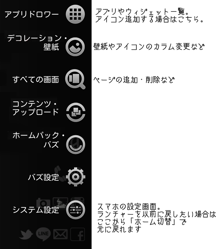 ※はじめてBUZZランチャーを使用するかたは、 まずBUZZランチャーアプリのインストールが必要になります。 上記「ダウンロード」をタップすると出てくる指示に従ってインストールして下さい。 A「取り変え」(今までの画面と完全に差し替える) もしくは「追加」(今までの画面にこれらのページを追加) が選べます。 あとで差し替えやページ削除ができますので、とりあえず「追加」選択。 ![]() B画面をスライドして確認し、「保持」→「確認」 ![]() 以上でインストールは完了ですが、 バズランチャーをインストールすると、このように、ウィジェット上に斜線と、 や 等のマークが付いてると思います。これは、皆さんの端末にこれらのアプリ・ウィジェットがインストールされていないという表示です。 上記マークをタップして、各アプリ・ウィジェットをインストールして下さい。 これらの機能が表示されます。 ![]() いつも使ってるメニューボタン(たいがいの端末は左下)をタップすると、 バズランチャーの設定メニューが表示されます。 ![]() こちらで細かいカスタマイズやアイコンの追加、 ページ削除が可能です。 バズランチャー使用前のホームに戻りたい時もこちらから戻せます。 OOAKベアランチャーはこちら>>こちら