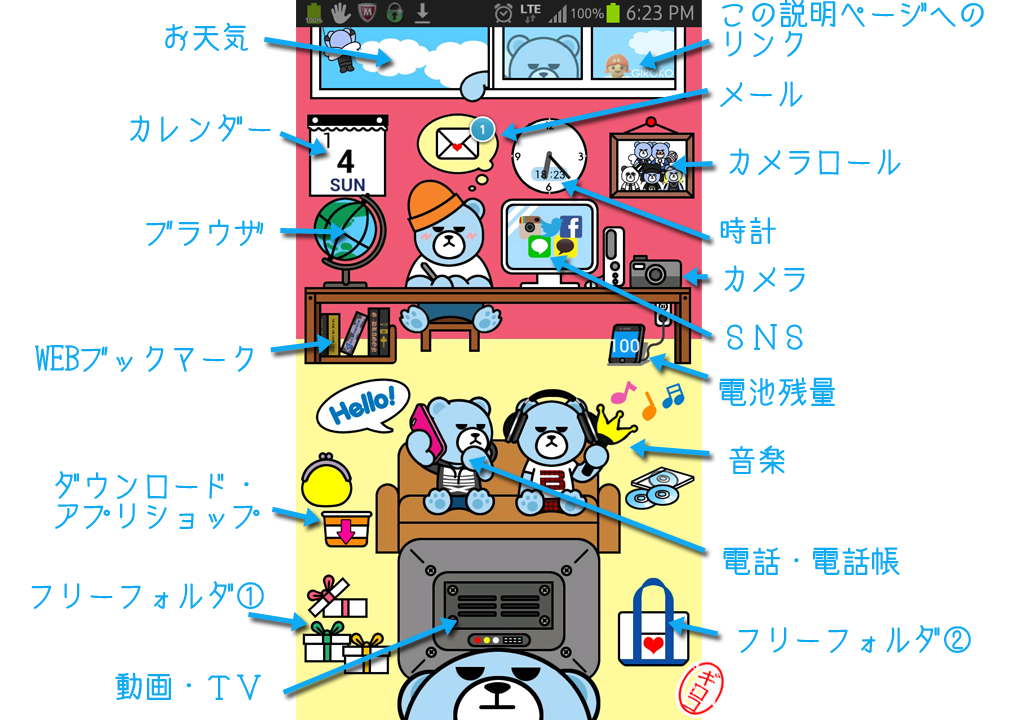 <<Back もどる ![]() (画面最上部から) 窓の外のてそん熊が飛んでる雲 ↓ 天気予報フォルダ 窓からチラ見してるギロコ ↓ この設置説明ページへのリンク 日めくりカレンダー ↓ 実際の日付曜日を表示 地球儀 ↓ インターネットへ 手紙を書いてる熊 ↓ メールフォルダ 壁かけ時計 ↓ 実際の時間を表示しています。 パソコンのモニタ ↓ SNS関係のフォルダ 壁にかかってるBB写真 ↓ カメラロールフォルダ 机の上のカメラ ↓ カメラ 机の下の本棚 ↓ Webブックマークリンクフォルダ 机の下のスマホ ↓ 実際の電池残量を表示 ガマグチ&↓印のBOX ↓ アプリSHOPやショッピング関係のリンク置き場 電話かけてる熊 ↓ 電話&連絡帳フォルダ ヘッドフォン熊 ↓ 音楽フォルダ リボン付きの箱3つ ↓ お気に入りアプリなど入れてください ハートのかばん ↓ YG関係フォルダ テレビ(の裏側) ↓ ワンセグや動画アプリ等 <<Back もどる |