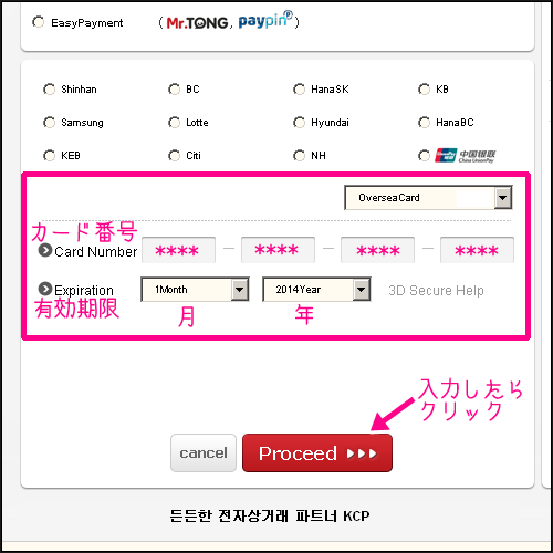 3Dセキュア(インターネット上の本人認証技術)に対応しているカード(VISA、JCB、MASTER)しか使えません。