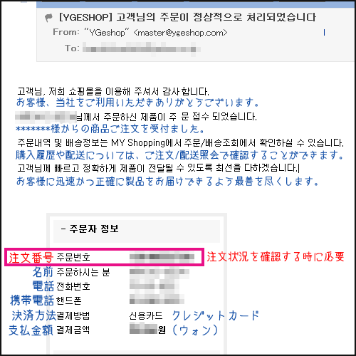 この注文番号を使って、注文をYGe-shopサイトで確認する事ができます。
