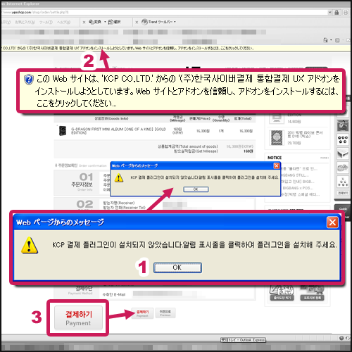 とりあえず、ハングルのアラート内のOKをクリックし(左図)、